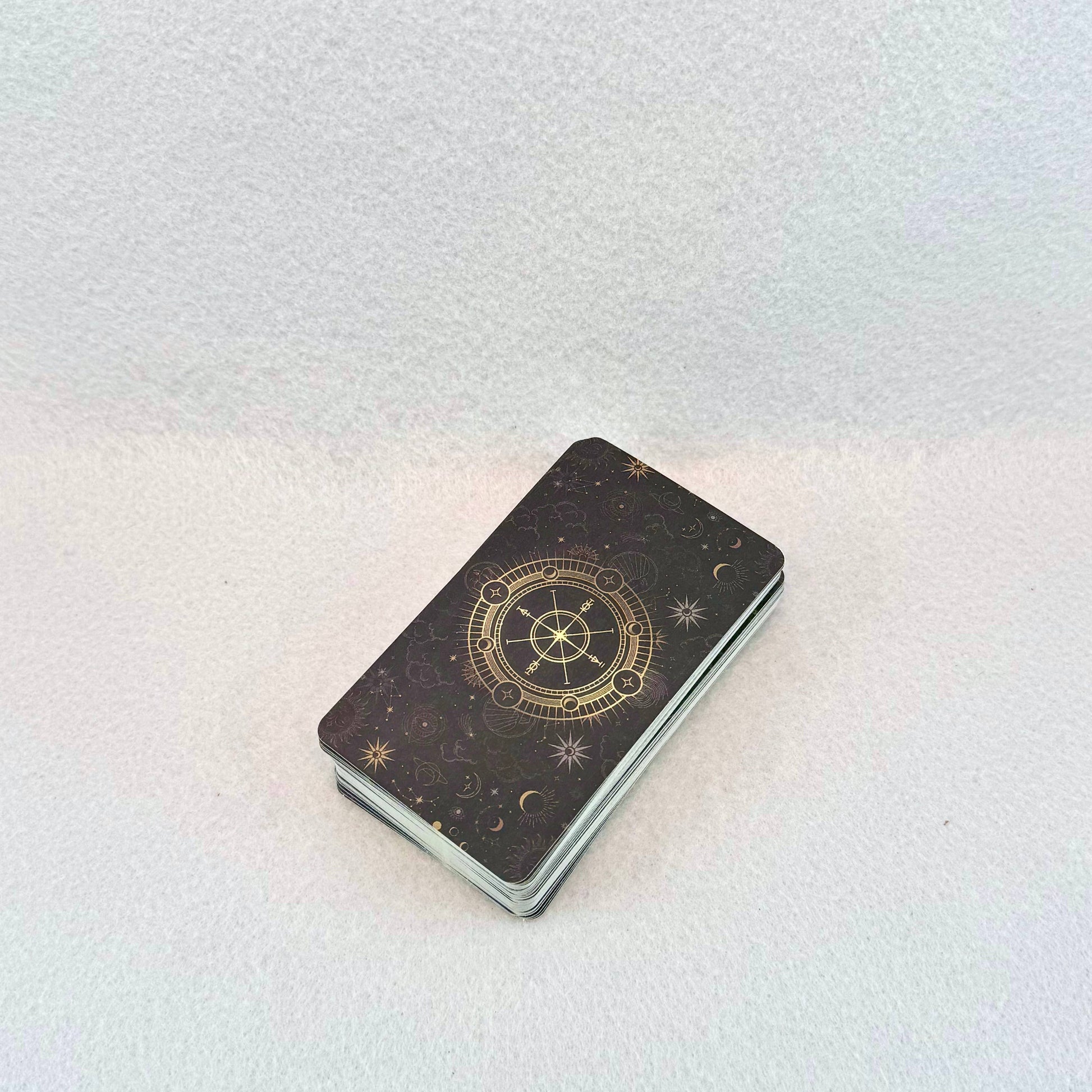 Includes Zodiac signs, elements, & planets associated with the different tarot cards. Antiqued look. Now comes tied up with a cute floral flourish (great for altars and ritual offerings) and velvet carrying pouch. String colors may vary. Crystals not included. Comes with QR code for deck instructions. Size: 6.5cm x 10.5 cm (like a regular deck of cards).