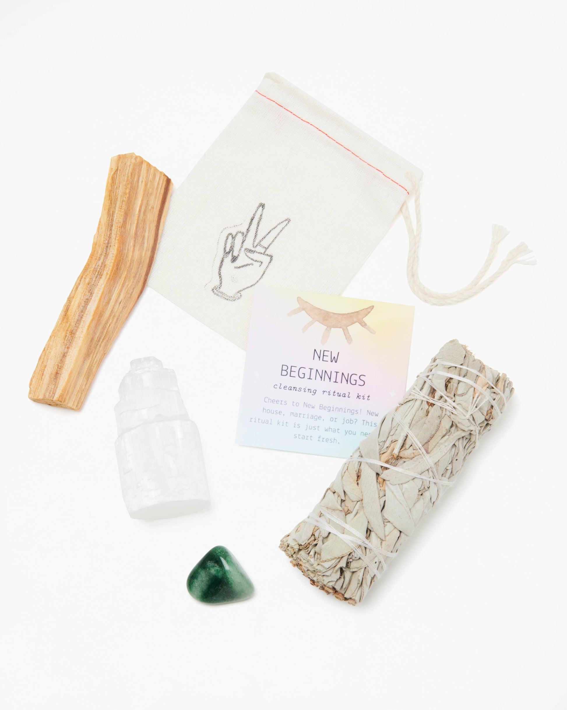 Includes: 1 sage stick: purify, release, cleanse 1 selenite tower: energize, charge, unblock 1 palo santo stick: uplift, enhance, soothe 1 tumbled green aventurine May come packaged in a box w/ clear lid, or clear bottle.